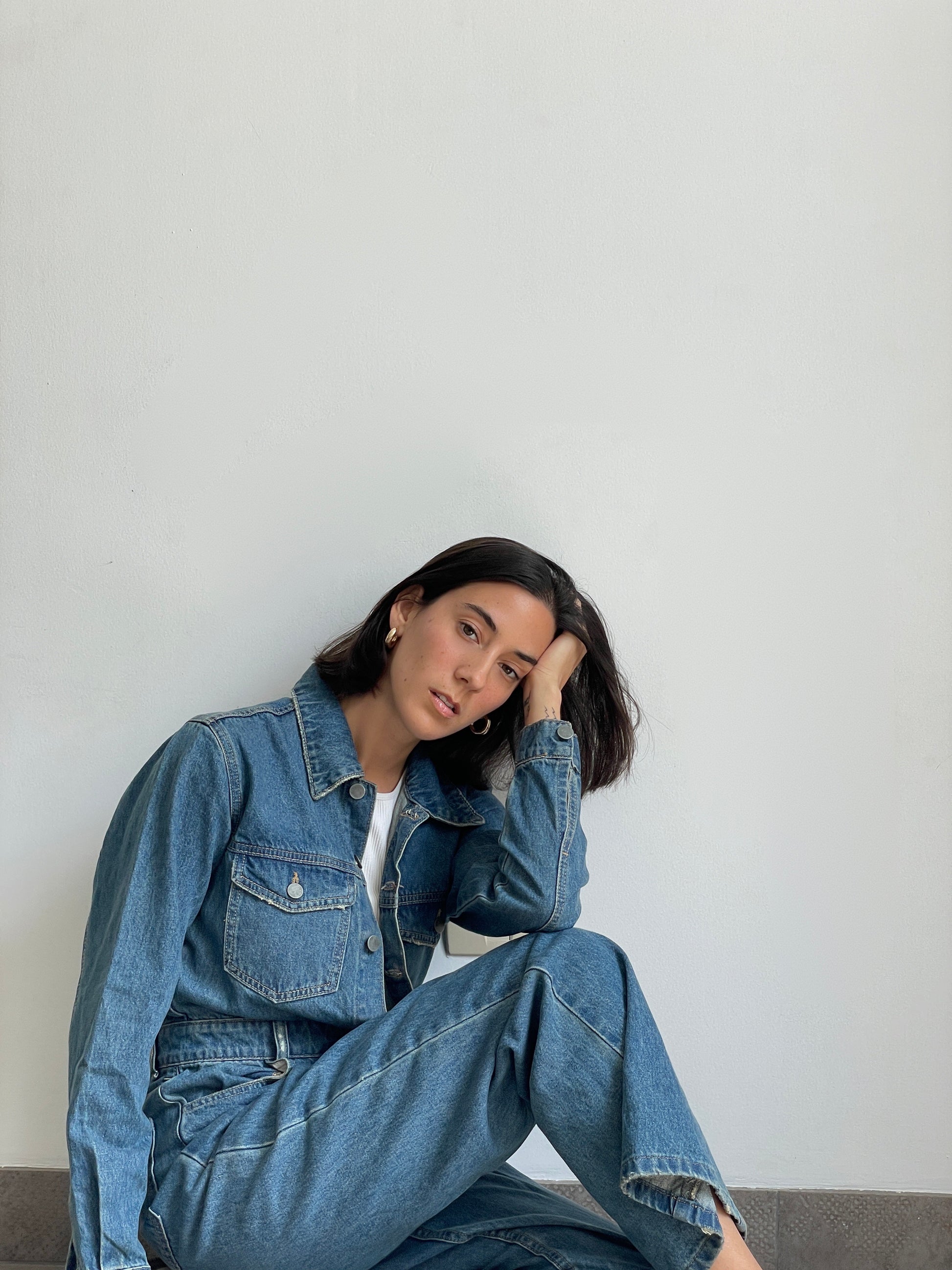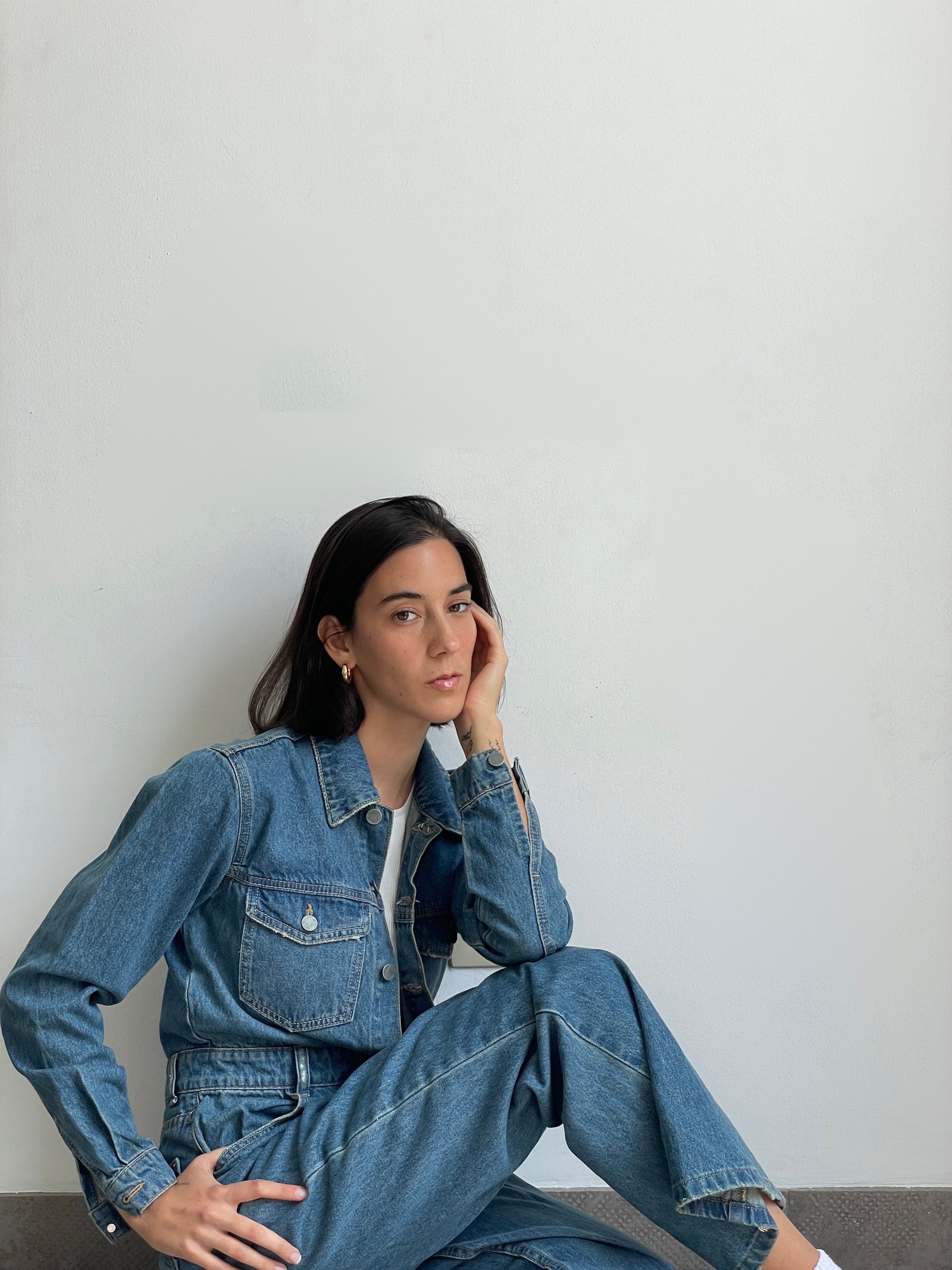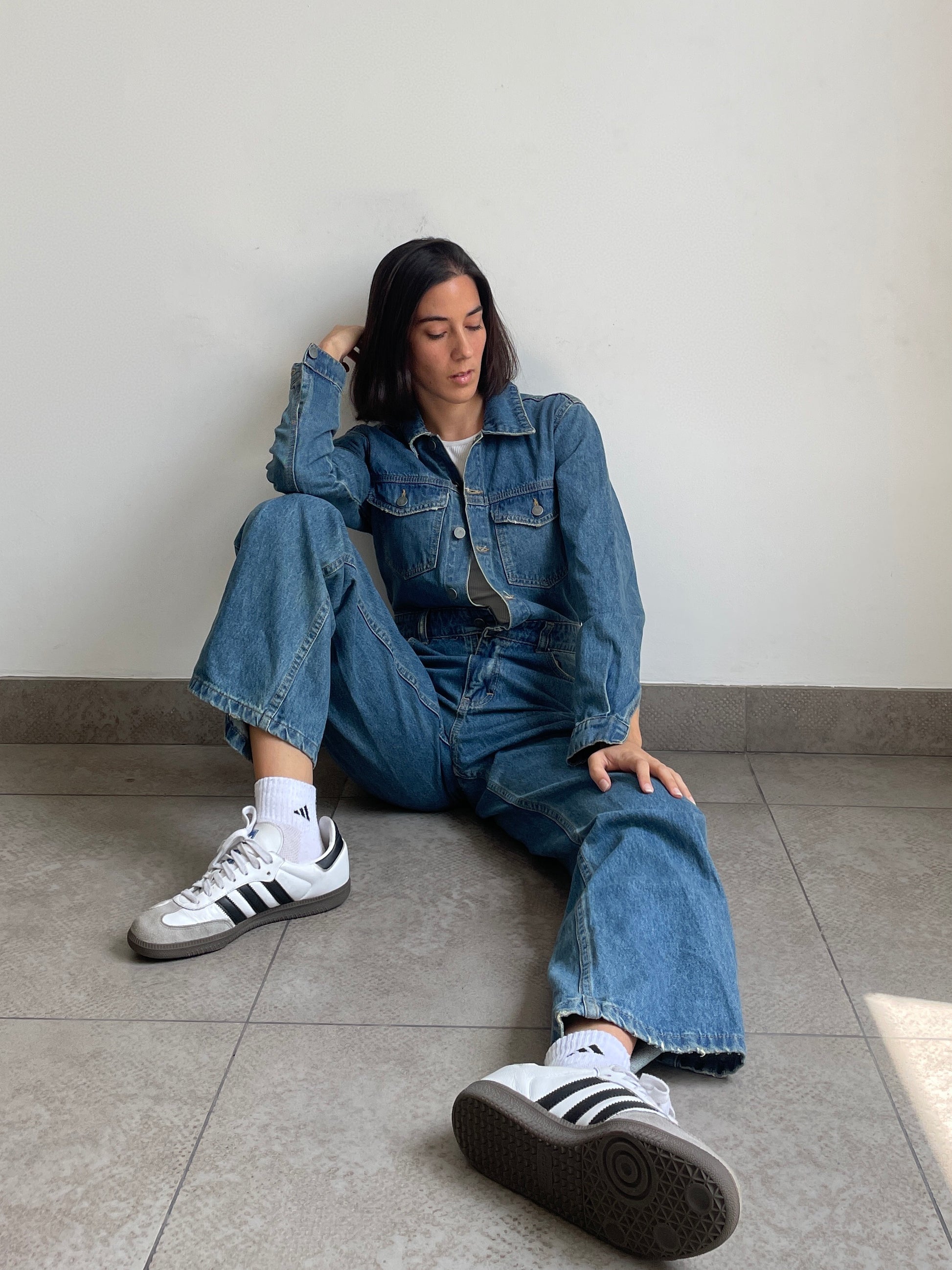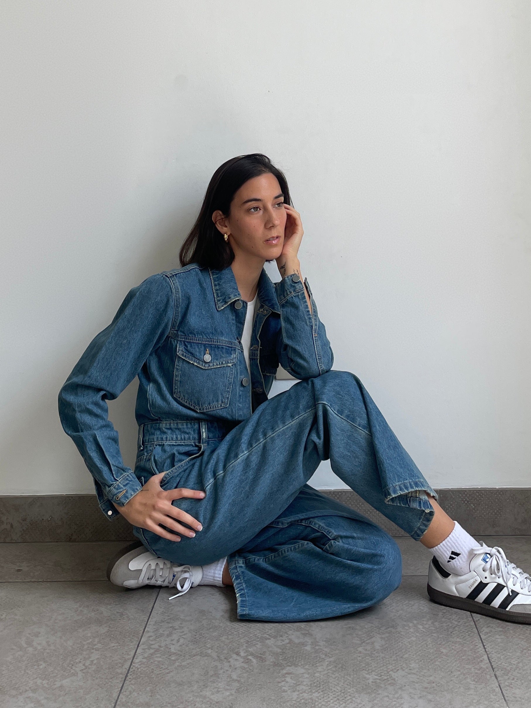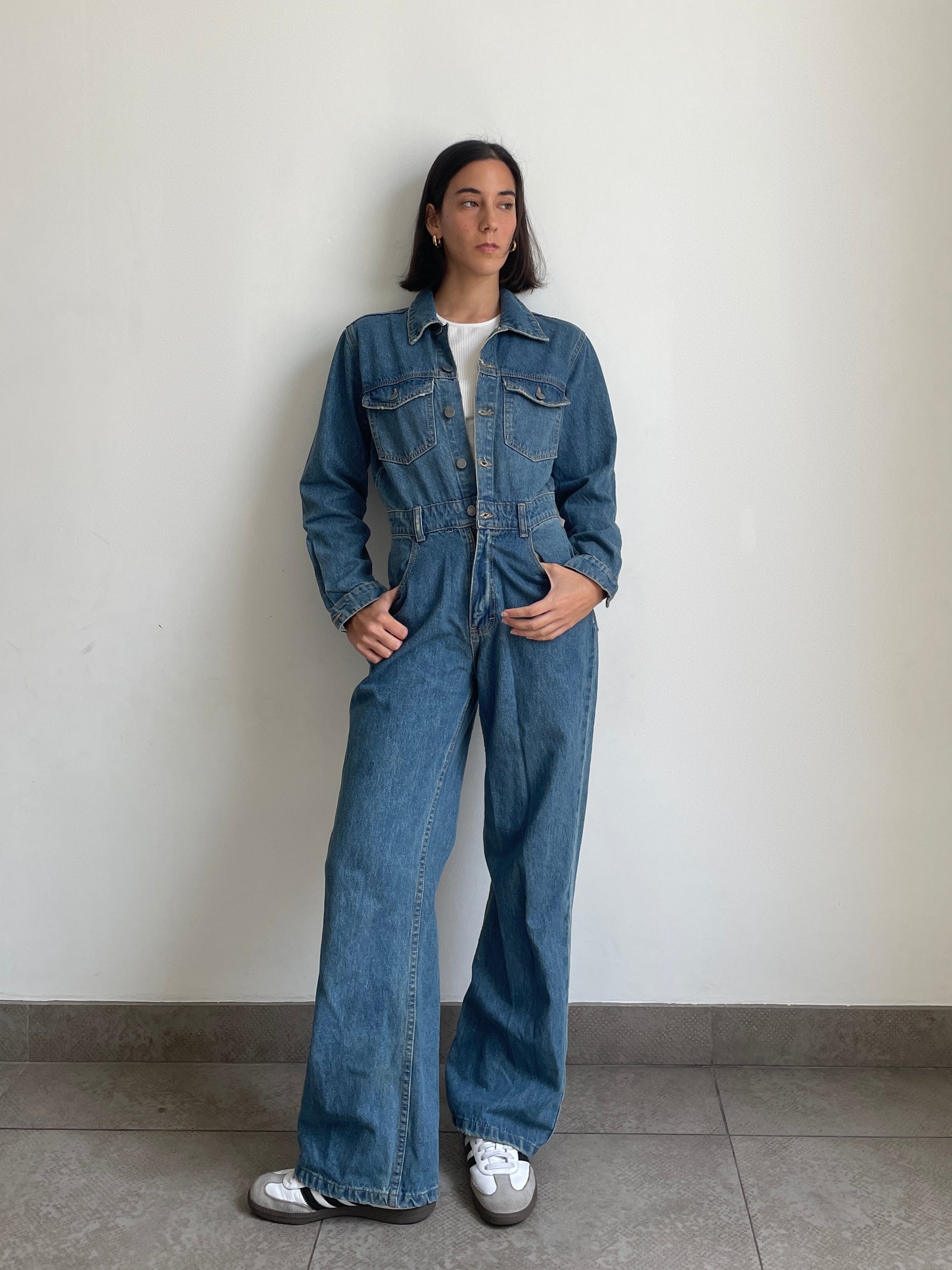 Unipieza. Versátil. Enterizo en jean rígido, con bolsillos, manga larga y pantalón estilo wide leg. Unico color disponible INDIGO