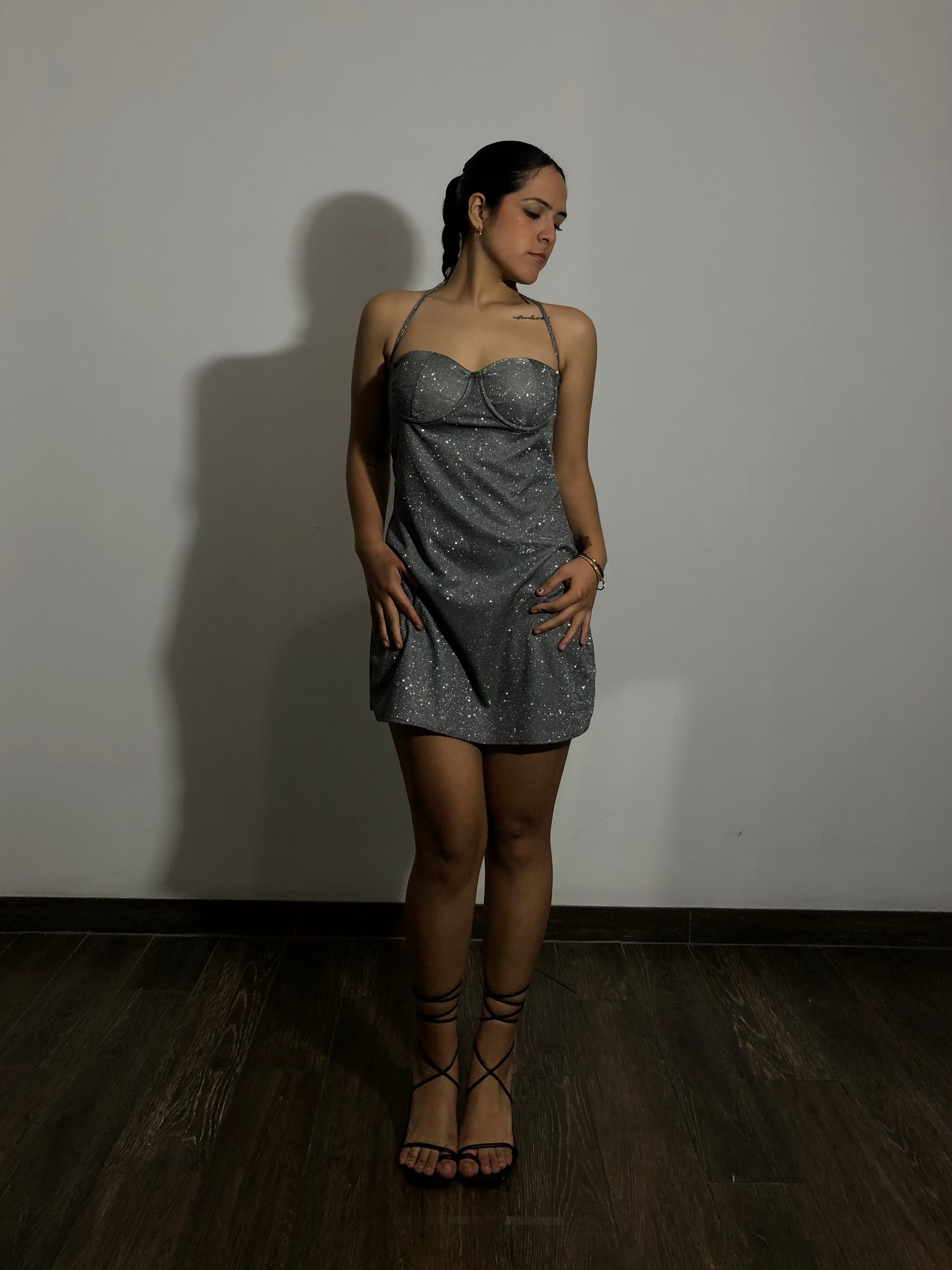 Vestido corto en una tela tornasolada y brillante. Con cierre oculto, copas y las cintas para que puedas ajustarlo como desees