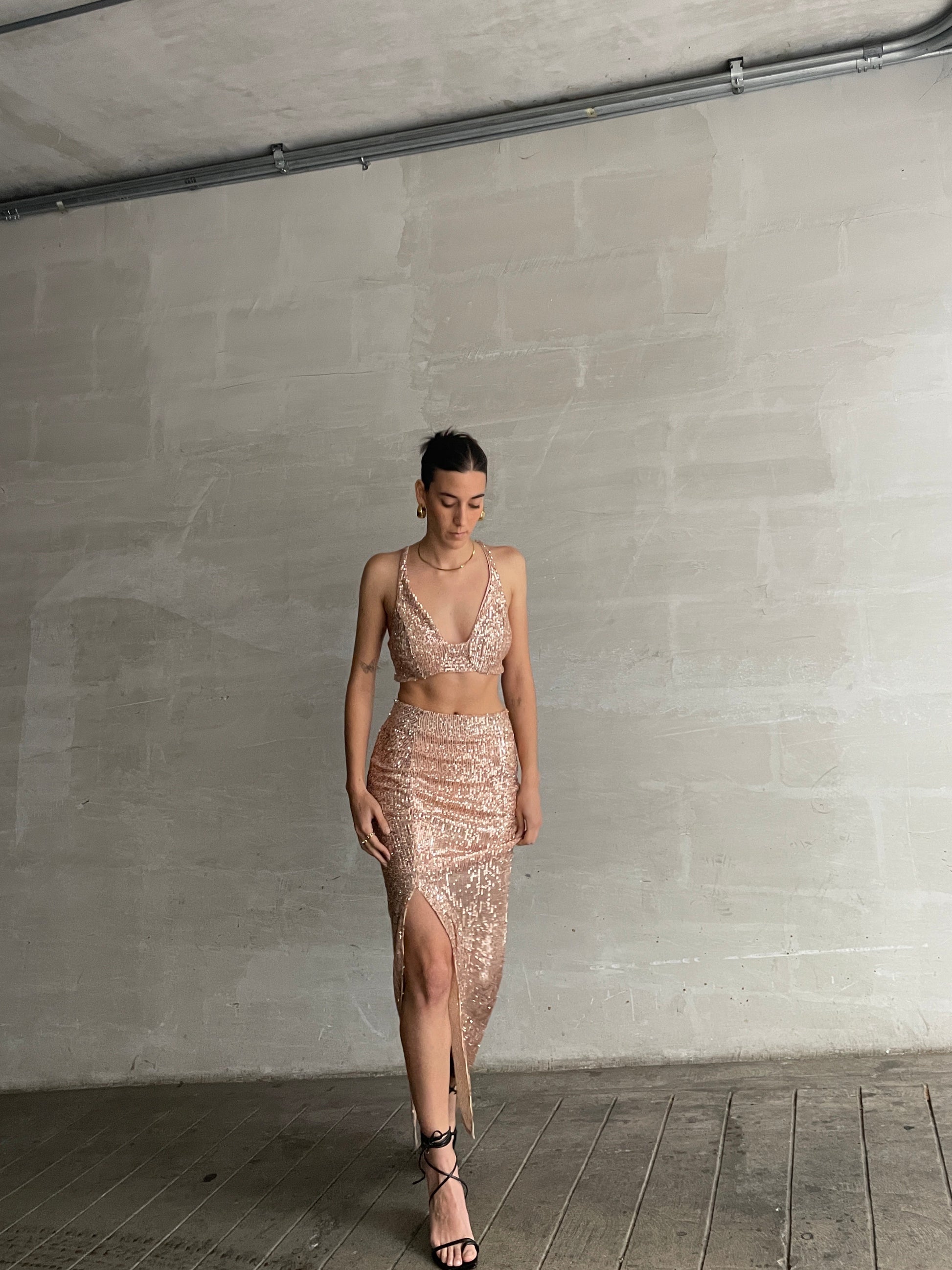 Conjunto de lentejuelas [top + falda larga] ambas prendas cuentan con forro y el top con reguladores para más comodidad.